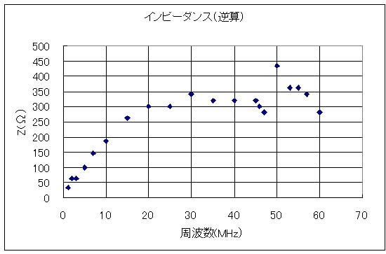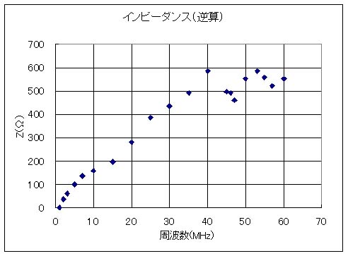 周波数が40MHzまでは、Zはほぼ周波数に比例して増加しており、誘導性である。コアが一定の透磁率を有することを証していよう。40MHz以上では実験の信頼性に問題があり、周波数に依存しない成分が主になるか否か分からない。