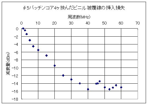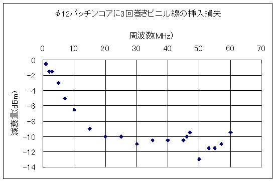 電線の公称断面積は3.5mm2、芯線はφ0.1mmであるが撚り線数は数えられない。全長250mmの線を上記コアに3回巻きした。測定法は(1)と同一の信号発生器とスペアナを用いた。