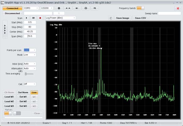 TinySAの操作と結果表示は専用ソフトウエアを通じてパソコンで行った。