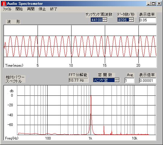 1kHzの信号をパソコンのラインイン端子に加えて、スペクトルを自作スペアナに