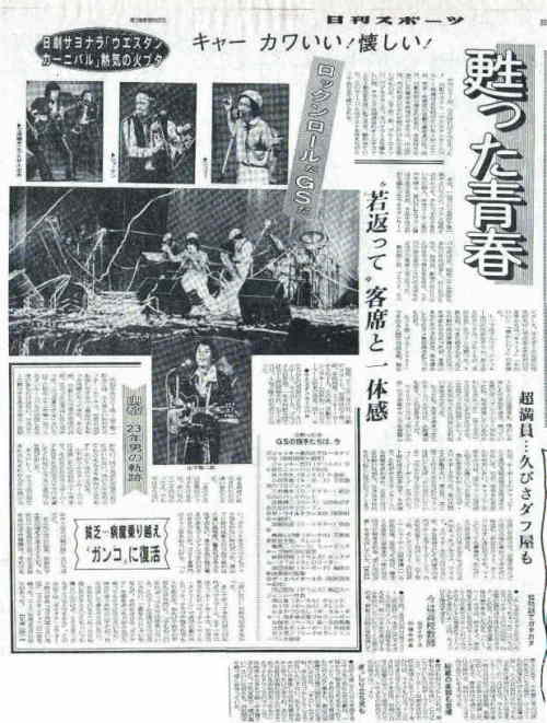| 日刊スポーツの記事は、第1回の日劇ウェスタンカーニバル出演者でもある、山下敬二郎にスポットを当てています。下の方には「今は高校教師〜元タイガースの瞳みのる」の小見出しで、ピーの不参加について書いてあります。“ジュリーらが出演を呼びかけたが返事はなし。この日取材に行っても「事前に連絡のない人とは会えない」の一点ばりで、ウェスタンカーニバルが開演された午後1時には同校で試験監督。教務に忙しく、芸能界とは絶縁したいようで、青春時代を過ごしたGS時代を、独特のクールさでみつめているようだった。”とあります。 |