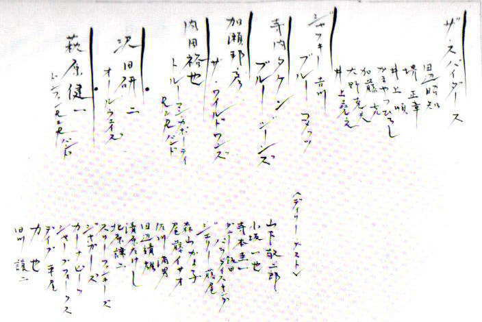 この他に、後半2日間はザ・タイガースの再結成。あと私が観た1月23日(2日目)には、望月浩と藤本好一がブルージーンズをバックに歌いました。藤本は広島からやってきて飛び入りしたらしく(トレーナーにジーンズという普段着でした)、多分寺内氏の楽屋へ挨拶した際に「お前、歌え」という事になったのでしょう。最終日には、当時ブルージーンズのボーヤとして再修業していたあいざき進也が、寺内氏に言われて1曲歌っています。森山加代子は、この当時「かよ子」と改名していました。