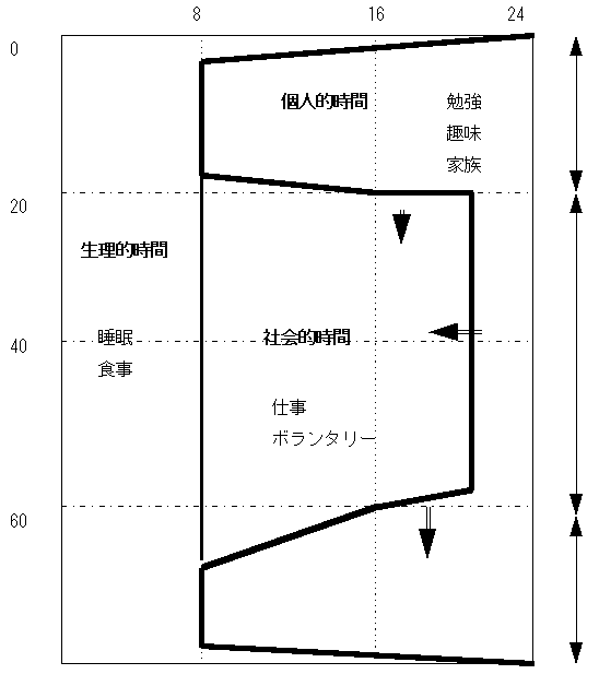 考えてみると我々の時間は睡眠や食事をする生理的時間と勉強趣味などに費やす個人的時間仕事をする社会的時間から成り立ちます。1日24時間、生まれてから死ぬまでを考えると下の図のようになります。