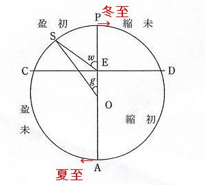 ![]() 薮内清,中山茂『授時暦−訳注と研究』 アイ・ケイコーポレーション,2006年,pp10 | 授時暦の定朔は、「ギリシャ的な幾何学的モデルを使って」(中山)、図のように解釈できるという。 Oは太陽軌道P〜C〜A〜Dの中心、Eが地球である。OEは離心率であるが、ケプラーのそれと区別して、以下ではこれをe2とする。 gは平均黄経、wは実黄経に相当する。 であるから、 Δ=w−g とすると、 これとケプラーの黄経式を比べれば e2=2e である。 |