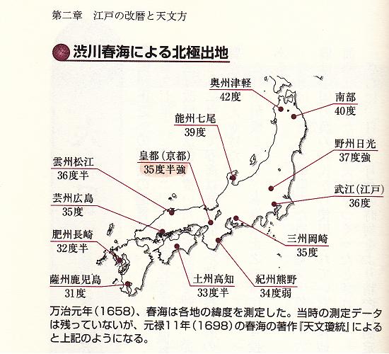 | 武江與南部南北行程相距一百三十里北極出地差四度置相距里数以差度除之約三十許里而北極出地之差一度也○武江與津軽南北行程相距一百八十里北極出地差六度此亦約三十里為北極出地差度用乗三百六十五奇則知一周凡一萬一千里地厚凡三千五百里○用商尺六尺五寸為間六十間為町三十六町為里也 |