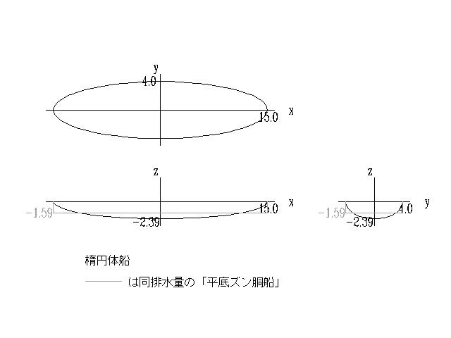 しかし、船底についても楕円という近似が考えられる。すなわち、上記の楕円甲板の船をその長軸(x軸)を含む鉛直断面(xz平面)で切った断面も楕円であり、また短軸(y軸)を含む鉛直断面(yz平面)で切った断面も楕円であるとする。これは数学的には次の方程式で表される楕円体である。