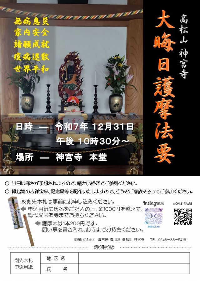 神宮寺では、12月31日(大晦日)に護摩法要を開催します。