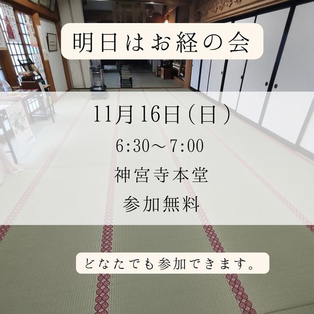 毎月 第1・第3日曜日の朝6時30分〜7時まで、お経を読む会を開催しています。