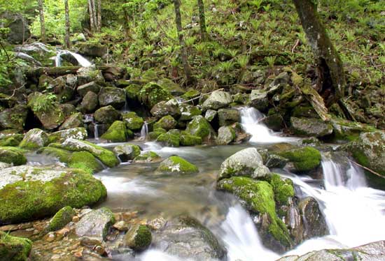 | 苔に覆われた岩、岩・・・その中を落走する幾筋もの流れ。源流の雰囲気が漂うB沢合流地点。右の沢は、落差の激しいゴーロが連続しているが、水量は以外に多い。気になる沢だったが、これまで一度も竿を出したことがなかった。今回、試しに岩魚の生息を確認してみたが、一匹も確認できなかった。また楽しみが増えたようだ。 「日が暮れると谷間は一層暗くなり、流れの音が強く聞こえるようになる。私たちは天幕の前で焚き火を囲んで夕餉につく。何にしても渓の食事は美味い。もみにもまれた美しい水でといだ米、ふんだんに岸辺に溜まっている流木を焚き木として、石を積んだ竈で飯を炊く。菜には岩魚がある。フキ、ウド、山なずななどの谷の植物もある。知らず知らずのうちに食べ過ぎるのが常だ。」(冠松次郎)・・・いつの時代でも、水と緑したたる渓の旅人にとって、岩魚と山菜は欠かすことのできない存在だ。それだけに、清冽な源流で岩魚と山菜を手にした者は、豊穣の森と渓に限りない畏敬と感謝の念を抱くようになる。日本人の心の原点、自然に対する畏敬と感謝の念は、人から教えられるものではなく、自然から直接学ばなければ決して得られない。 |