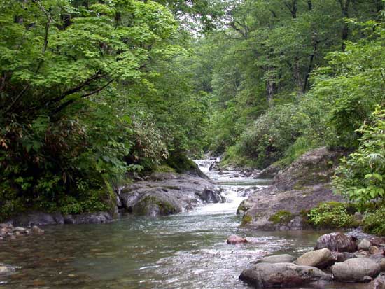 | 両岸ブナの深緑に包まれた胆沢川。テンカラ釣り場としては一級品だが、走る魚影は見えなかった。車止めから杣道が右岸にあり、ここから左岸に変わる。それを知らずに沢を上ったら、だんだん両岸が切り立ってくる。と同時に雨足も強くなってきた。右岸の道を探すも、切り立つ崖を登らされるだけだった。 | |