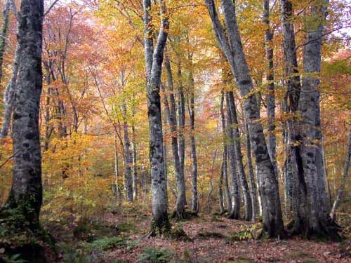 | 太くどっしりしたブナの幹、ブナの肌をおおう地衣の絵模様、森を染め尽くす黄色と紅・・・実に美しい。やっぱり寄り道するだけの価値はあった。 | |