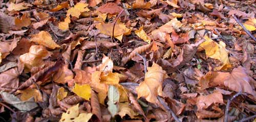 ブナの森の林床は、まるで分厚い落葉のジュウタン・・・落葉が腐ってできた腐葉土は、虫や微生物の棲家となる。登山靴一つの足にトビムシ類は1000匹もいるという。この虫たちが、落葉を分解し、自然にかえす働きをしている。森の営みの連鎖・・・森は、まさにリサイクルの精密工場なのだ。「シモーン、お前は好きか、落ち葉ふむ足音を?夕べ、落ち葉のすがたはさびしい、風に吹き散らされると、落ち葉はやさしく叫ぶ!シモーン、お前は好きか、落ち葉踏む足音を?」(ルミ・ド・グールモン) ・・・落ち葉にも多くの命が隠れているのだ。 |