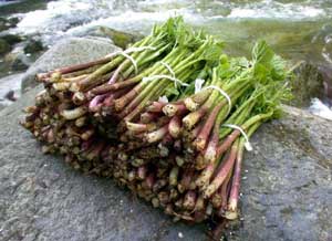 | 雪解け水は、身を切るほどに冷たい。その冷たさが極上のワサビを育む・・・本場のワサビを楽しむなら雪国の源流に勝るものはない。天然物は、栽培のワサビと違って根が細いから、もっぱら根の上部からナイフで刈り取り、茎から上の全草を食用にする。根と同様、全草がワサビ特有の辛さを味わうことができ、「葉ワサビ」などと呼ばれている。茎の太いものを選び、間引くようにナイフで刈り取るのがコツ。 | |