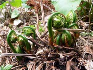 | 谷沿いの斜面や渓流沿いに生える。葉が開く前、丸く巻いた若芽の先の部分をつみとる。右の写真のように、あっという間に伸びるので、採取適期は意外に短い。茹でると鮮やかな緑色と特有の香り、クセもなく万人に好まれる山菜の一つ。茹でたものをマヨネーズで食べると美味い。生のまま、衣をつけて揚げ物、汁の実、煮物、炒め物にも最適。たくさん採取した時は、茹でてから冷凍にするのが最も簡単な保存法だ。