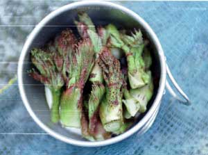 | 5月上旬、ブナの源流で採取したばかりのシドケ、アイコ、コゴミ。山で美味しく料理するには、全ての調味料をコンパクトな容器に入れ替え持参するのがベスト。 | |