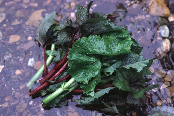 | 大量に採取した場合は、右の写真のように葉の部分をちぎり取り、新聞紙に包んでザックに背負う。家では、根を水に浸すと硬くなるので注意。新聞紙に包んだまま野菜室に保存するのが一番。茹でてから渓流水にさらし、皮をむいてから適当な長さに切る。マヨネーズや醤油をつけて食べると絶品。炒め物、汁物、和え物も美味い。保存用に味噌漬けにすると、これまた絶品。