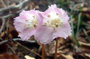 | イワウチワのアップ・・・ブナの森では、この花が終わらないと山菜の最盛期には程遠い。乾いたブナの斜面に群生し、花も比較的大きく、淡いピンクが美しい。4月下旬ともなれば、久しく姿を見ることができなかっただけに、妙に懐かしさを感じる草花だった。 |