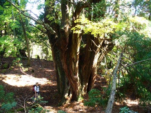 雷杉の小広い尾根上で寛ぐ人が多い。ここから北進して尾根を徐々に下りていく。どでかい杉が次々と