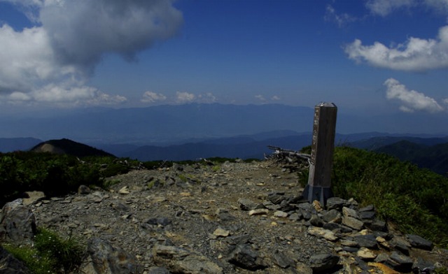 東には蝙蝠岳の右に雲を掛けた富士山が見える。北は甲斐駒・仙丈、間ノ岳や北岳、南は前小河内岳と小河内岳の間に