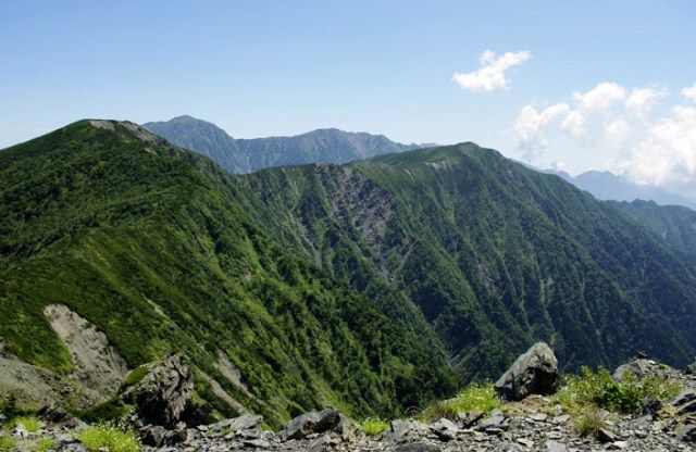 そして辿り着いた尾根の南面は険しい崩壊の壁となって切れ落ちている。しかし展望が良い。小河内岳から南の峰々。