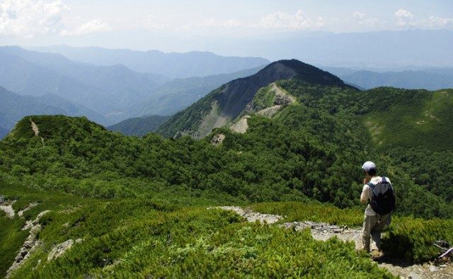 三伏峠小屋の手前にて (中央・本谷山、右・塩見岳)