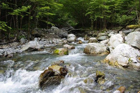 取り付きを過ぎて最初の木橋のある沢でひと息つく。轟音の脇の水たまりで顔を洗うとスッキリした。常念岳の一ノ沢が