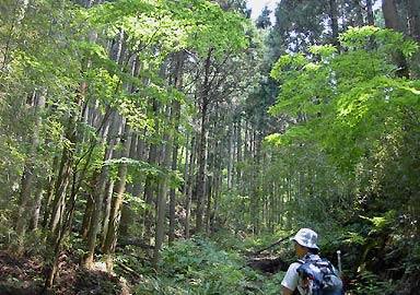 林床は日陰。下草は少なく歩きやすいが、正直いって落胆の歩きであった。やがて雑木林に変わり、