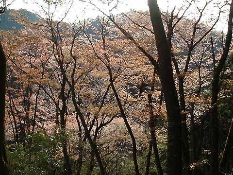 西の展望岩で小休止。北の谷に満開の桜がある。静かだが、ウグイスやカラなどの野鳥が