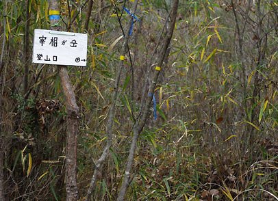 もう一つの小さなため池があり。その手前のササヤブに怪しい標識があった。「宰相ヶ岳 登山口」。
