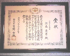 O私は、開局から15年で達成し、平成8年9月25日読売新聞社で表彰を受け、読売新聞社よりの表彰状と記念品のトロフィーと世界時計、同時に郵政大臣から表彰状を頂きました。