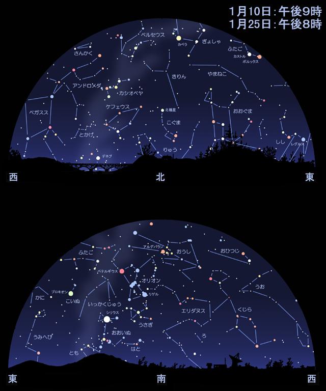 ところで,1月のことを日本では古来から睦月(むつき)とも言いますが,この語源は,正月は,身分の上下も老いも若きも関係なくの親族・友人達が一同に会してお祝いすることから,睦みあう月という意味だそうです.見上げる冬の星座たちもオリオン座を中心に,仲睦まじく光り輝いているように見えてきますね.