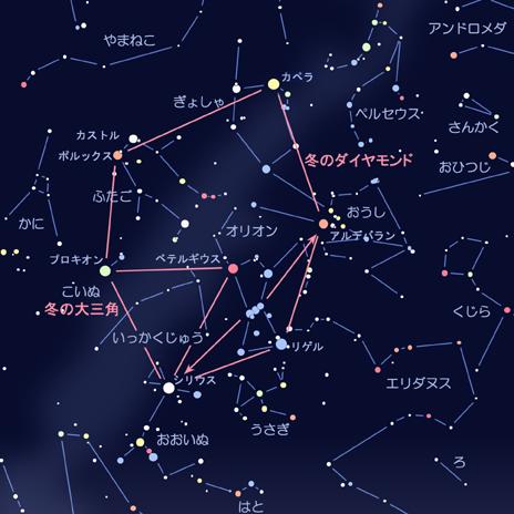 の七つの星(これらは1等星)を冬のダイヤモンドといいます。都心からでも見えるので是非、南の空を見上げてみましょう。