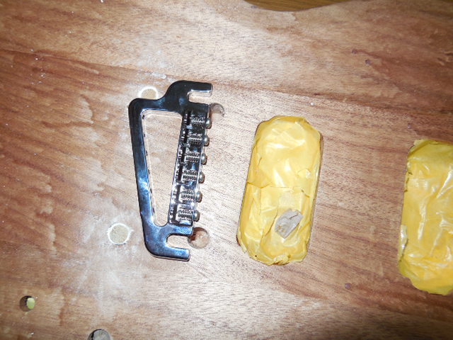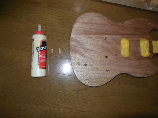 | 今回もタイトボンドでテールピースの穴をふさぎます。タイトボンドは、必需品ですね。