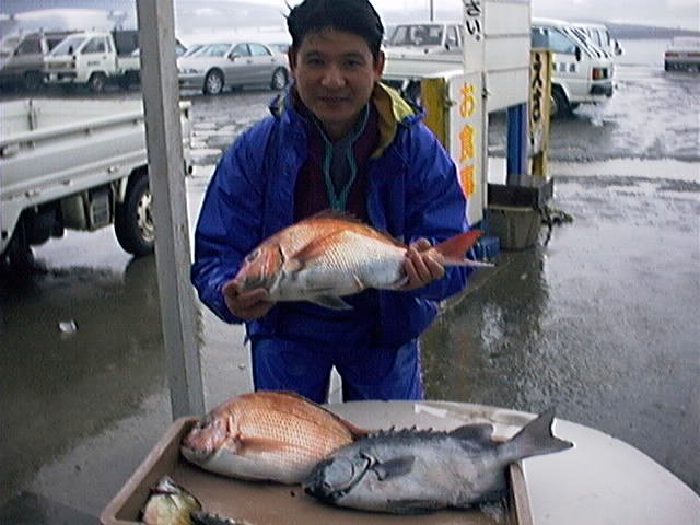 畠中さん、タイを釣り上げ絶好調、タナを高めに取り釣りましたと、言ってました。この次は、あなたの番です。大物を釣ったら言ってください。インタ−ネットに載せますよ。 30日は南の風が心配です、朝出掛けに電話してからお越しください。タイも面白いです、タイ、イナダ五目、イナダとハナダイ、好調。アジも型良く大アジが多く、サバも大サバです。アマダイも型が良く潮さえ動けば楽しみです。タイ、イナダ五目2隻とマダイ船1隻、アマダイ1隻、アジ1隻を出します。どの釣りも色々な魚が釣れてます、自分が好きな釣物なら、これと決めずに良い席が空いてる船に乗った方が良いでしょう。道具は色々持ってきてください。そのほうが楽しい釣りが出来ると思います。 釣り方、ワンポイントアドバイス、どの釣物も面白いです、こんな感じで釣って下さい。 タイ、イナダ五目は、ウィリーで下針がカラ針ならオキアミを刺します、ハリス2号で3本針で、竿は2.1ー2.4メートルで先調子がベスト、釣り方は、竿をシャクリ上げて止めて竿を下げる時にリールを1回巻く、竿上げて1、止めて2、リールを巻いて3、1、2、3とリズムよく釣る、タナも底から10メートルぐらいを探って下さい。