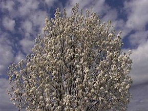 近所の家の梨の花。道の脇に、ぼーっと見えるのが梨の花。既に花が散り始めたのか、葉の割合が多いのでそんなに白く見えない。葉桜か、葉梨でしょう。というハナシ(^o^)