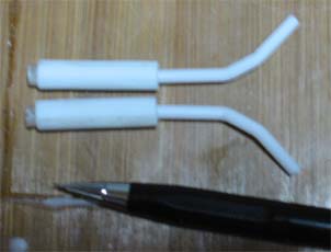 正確にはエキゾーストパイプとマフラーですか。ZZRの排気管は4−2−1−2(4つのシリンダーから1本ずつ排気管がでて、途中で2本、1本にまとまり、最後に2本にわかれて左右に出る)というちとややこしいタイプなのですが、どうせカウルで見えないし、オミットオミット。外に見える最後の2−排気までを再現してあります。