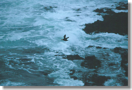| 大学2回生の夏、道内周遊券を握り締め、野郎ばかり4名で大阪を出発しました。メンバーは私と同級生S、1回生YとSt。今は廃止になったJRの特急「白鳥」、青函連絡船を乗り継ぎ、更に東へ。やって来たのは霧多布のトッカリ岬。その名のとおり、霧雨が降る霧多布はうすら寒く、トレーナーを着て、雨合羽を着込んでも、ガタガタ震える程の気温でした。 岬近くのキャンプ場で3日間野営。バンガローも併設されていましたが、1泊500円もするのでとても手が出ません。まして、当時できたばかりの民宿「えとぴりか村」なんて、一生泊まれないなあと、横目に見ながら通り過ぎたものです。悲しき霧雨のキャンプ。ただ、嬉しかったのは、同じキャンプ場でキャンプしていたカメラマンに、花咲ガニをコッヘル山盛りに頂いたこと。ジャガイモラベルの「ひぐま」なる妖しい焼酎を飲みながら、さっそくゆがいて「ガフガフ」食べました。狭いテントの中、じわり身体が温まりました。 この岬の目的はエトピリカ。日本でこの鳥が間近に見られるのはここだけでした。荒れる海の彼方から、ゼンマイ仕掛けのオモチャのようにパタパタ飛んでくるエトピリカ。雨の中、75〜150ミリのズームレンズで撮った写真が上の写真です。下手な写真ですが、岬からエトピリカの消えた今、僕にとっては大切な1枚です。 |