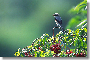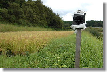 | 「百舌鳥」と書いて「モズ」。その名のとおり、モズは物真似の上手い鳥だ。暑い夏は平地を離れ、山地や北国で過ごすという。そういえば青森にいた頃、夏になるとモズの数が増えていたし、関西でも夏、少し高い山の林道を走っているとモズの姿が目に付く。そんな避暑地で夏鳥たちの涼しげな囀りを覚え、秋、モズは下界に降りて来る。秋や冬に季節外れの夏鳥の声を聞いて喜んでいると、藪からモズが飛び出すことがある。僕もモズには何度か騙された。 朝夕、ようやく涼しい日が続くようになったので、そろそろ小鳥たちの秋の渡りが始まっているかも知れないと思い、近所の公園に出かけてみた。涼しくなったと思ったのは気のせいで、歩き始めるとやはり暑い。背中のザックが汗でへばりつく。遊歩道沿いにハギやオミナエシの花が咲いて、栗の木にはイガグリがいくつもぶら下がっているのに、空気だけは夏みたい。 渡りの小鳥が好みそうな実のなる木は何本もあったが、先日、大暴れして関西を吹き抜けた台風16号の影響だろうか、実が地面に随分散らばってしまっていた。これでは鳥たちも大変だろう。 何の成果もなく汗を拭き拭き歩いていると、林の向こう側から只事ではない声が聞こえて来た。「ギャーギャーギャーギャー」。鳥に違いない。「ギャーギャーギャーギャー」。悲鳴に聞こえる。そうでなければ怒りの叫び。なんだろう、カラスかヒヨドリの雛?それにしても声が大きい。足を速めて声の方向へ進む。鳴き声は断続的に続いていた。声の質からすればモズも候補に入るかな、そろそろ山から降りて来る頃だろうし。いろんな鳥が脳裏に浮かんでは消える。 声は公園の外の田んぼの向こうから聞こえて来る。迷わず先に進む。どんどん進む。「ギャーギャーギャーギャー」。いよいよ近づいて来た。「ギャーギャーギャーギャー」。声の主はもうすぐだ。 田んぼの端に立てられた杭の上に、小さな黒いスピーカーが紐で括り付けられていた。「ギャーギャーギャーギャー」。約30秒間隔でスピーカーは鳴いた。「ギャーギャーギャーギャー」。モズに騙されたのならまだ納得できる。僕が騙されたのはいわゆるハイテク案山子、ただならぬ鳴き声でスズメを追い払う農家の秘密兵器だった。 すっかり湿ったバンダナで額から流れる汗をぬぐう。「ギャーギャーギャー!」。びっくりするくらいのスピーカーの音量に、鳴ると分かっていても思わず腰を抜かしそうになる。(うぬ〜・・・)。何とも言えぬ敗北感を味わいながら、僕は、来た道をトボトボと引き返すのだった。 |