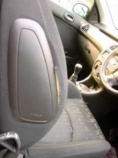 | 運転席シートの側面。中の黄色いスポンジが見えている。 |
