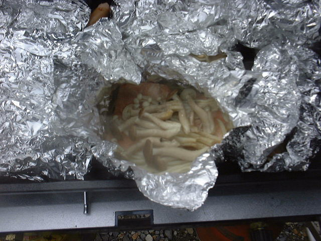 材料:玉ねぎ(スライス)、生鮭の切り身(鱒とか他の魚でもOK)、シメジ、えのき