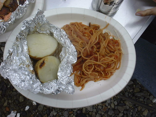 材料:バスタ パスタソース 玉ねぎ(スライス)、バーベキューで用意した野菜や肉類。