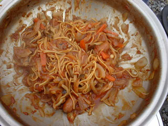 C水分がなくなったら、パスタの硬さを見、まだなら、水を足し、煮込む。いいようなら、オイスターソース、塩胡椒、ウスターソース、ケチャップ等で好みの味に整えてください。