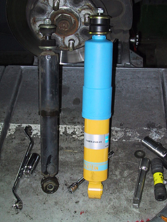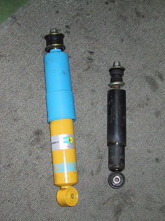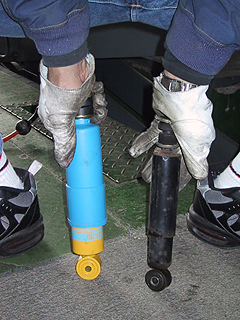乗り心地も悪いし、不整地を走るとどっか飛んでいきそうになるし、冬なんかはちょっとの積雪でも腹摩って走ってるしで、大変なので、ノーマルタイヤ(新品)に替えるついでにショックも交換することにしました。 今回も「タイヤハウス」さんにお願いして、ショックはビルシュタイン(ノーマル形状)、タイヤは今までと同じピレリのドラゴに交換です。 |