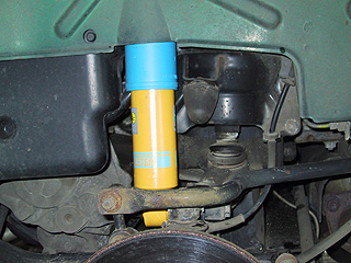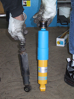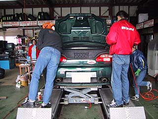 ここで、早速フロント交換の効果が出ました。フロントを交換する前にリアを1回リフトアップしてみたのですが、フロントが完全に沈んでバンパーが当たるので上げられませんでした。フロントのショックを交換したら、余裕で思いっきりリアを上げられるようになりました。社長曰く「やっぱり、フロントが元気になると違うなぁ!!」 |