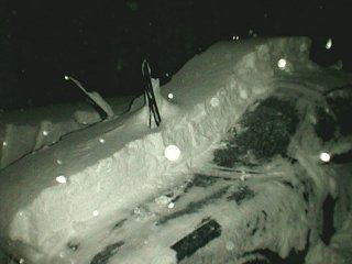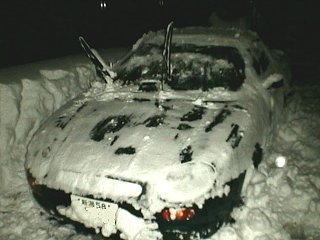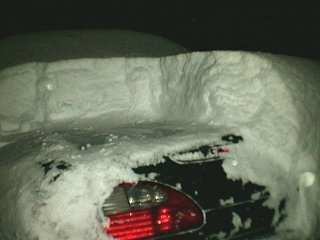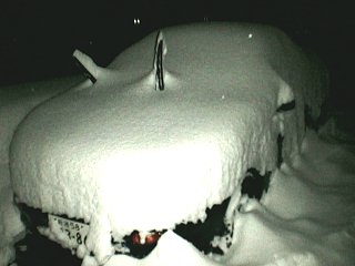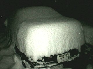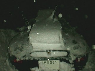 いままで、冬になると私はクルマを新潟市の実家に預けて、1月から3月まではクルマなしの生活をしていました。なぜかというと、長岡は雪が降るからです。いや、雪が降るのは良いのですが、駐車場に消雪施設(注:地下水をくみ上げて、道に撒いて雪を融かす設備で、長岡市では広く普及しています)がなく、クルマが雪に埋まってしまうからです。毎日、朝晩クルマに積もった雪を落とす手間だけがかかります。しかも落とした雪がクルマの周りに堆く積もって、いざ、休日にクルマで出かけようと思っても、1時間くらい雪かきしてからでないと駐車場から出れないのです。 そんなわけで、通勤にクルマを使っていないこともあって、冬は雪の少ない新潟市にクルマを冬眠させていました。 ところが、この冬は、アパートの大家さんが消雪設備を導入したので、雪かきの手間が要らなくなりました。そこで、試しに初の越冬をさせてみようということになったのでした(あー、説明が長いね。ここまで呼んで下さった方、ありがとう)。 で、降りました、12時間で30cm以上。 |