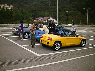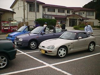 しばらくすると、やっぱりサイトーさんの黄ビートと、あたあたさんのゴルフ・カブリオも登場して4台に。 |