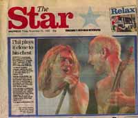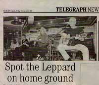 翌朝、街を歩いていたら、新聞売りのスタンドで「フロントページは DEF LEPPARD!」 という貼り紙が目に入った。近づいて見ると、なんと、THE SHEFFIELD STAR紙(左写真)の1面にジョーとフィルが並んで写ってるカラー写真が! すぐに買いこみ、読みふける。