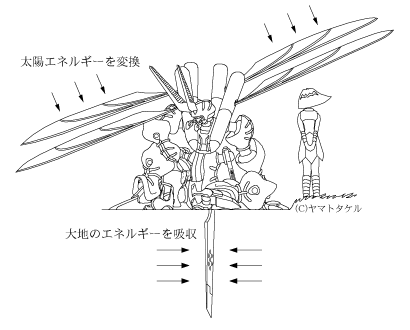 ↑エネルギー補給の様子。コンセプトにある植物というのはここから来ている。羽から太陽エネルギーを、尻から伸びたブレードから大地の養分を吸収する。尻のブレードは昆虫でいう産卵管をイメージしている。なお、この絵は、見てわかるとおりヤマトタケルのエンディングのぱくりである。 |