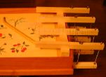 sound boardの上面に艶消しワニスを塗った。少し薄めたものを1回塗りした後にペーパーをかけ,2回目を塗って仕上げた。これでsound boardの部分はbridge pinを打って本体に貼り付ければよい段階となったので,おねえさんにフラワーペインティングをしてもらうことにした(写真a)。今日は半分くらいまで書き終わった。