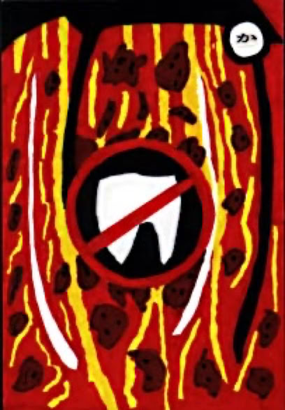 歯に禁止マークで「噛むなよ」。ではバックの不思議な絵柄は何?